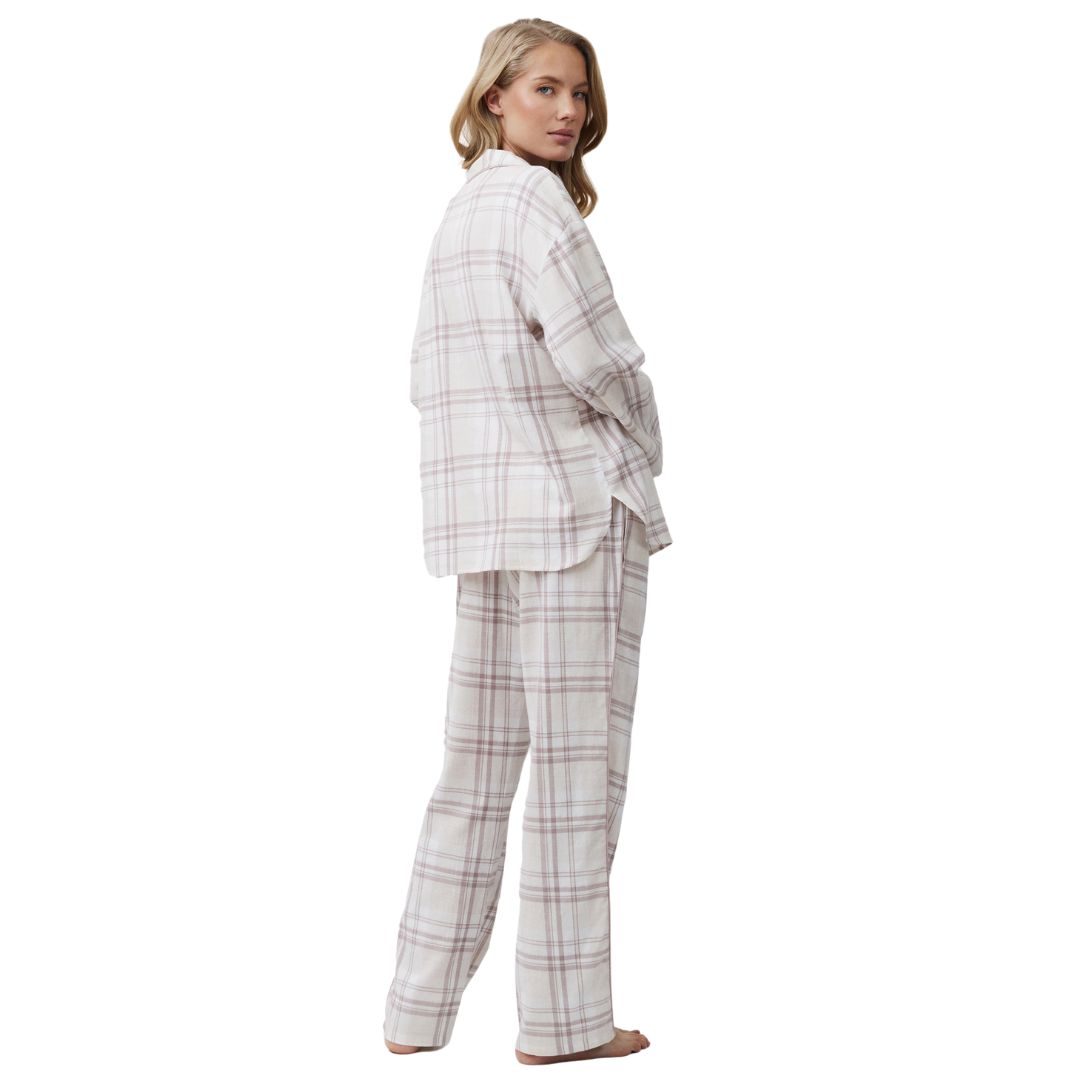 Πιτζάμες με καρό σχέδιο και λιλά πινελιές.